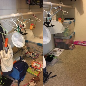 Then I tackled the closet. My daughter has spent a month making it her special daycare for her stuffed animals. But it was out of control and no longer fun to play in there. So I kept all the items in there and just reorganized. She loved the end result!