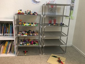 We got new shelves from our neighbor. I used one for books and toy bins. The other two become the LEGO display shelves, one for each child.