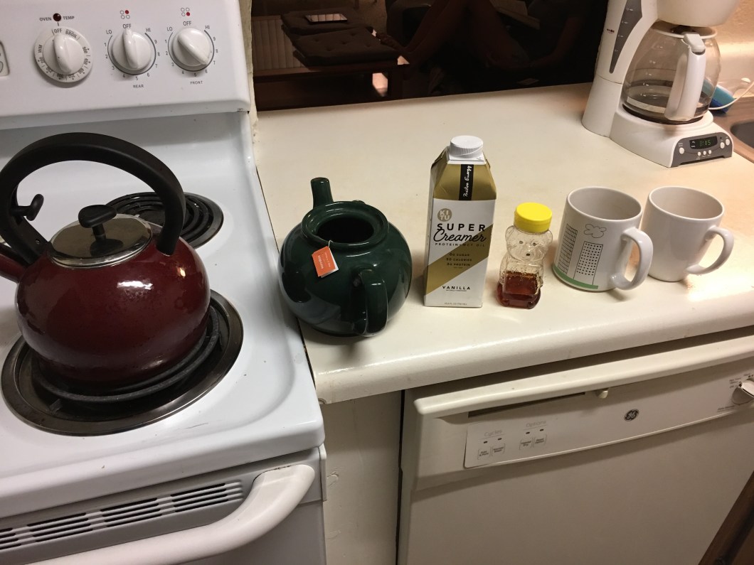 Getting the teapot and mugs out. Picking a tea flavor. Table set. Breathe.