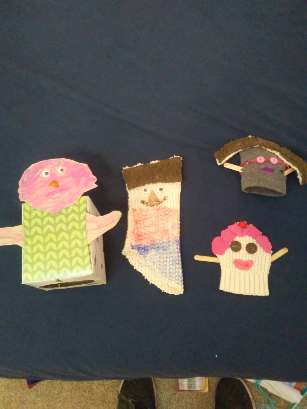 We checked out puppet making books, gathered old clothes for fabric, and a couple weeks ago finally found time to make puppets.